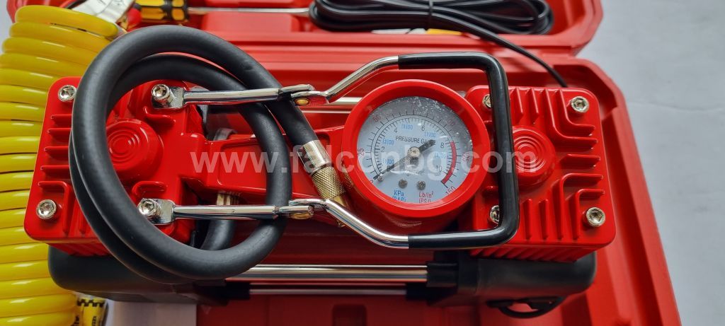 Компресор с манометър за помпане на 4х4, микробуси, ATV, камиони, автомобилни и велосипедни гуми, въздушни матраци и надуваеми принадлежности.